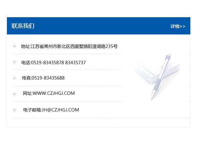 地址:常州市新北區友邦商務大廈1幢16、17層  電話:0519-85101652  傳真:0519-85112595  郵編:213022  網址:www.cz-jiayue_cn.wfhaiyuan.com  郵箱:xiajifengaa@163.com